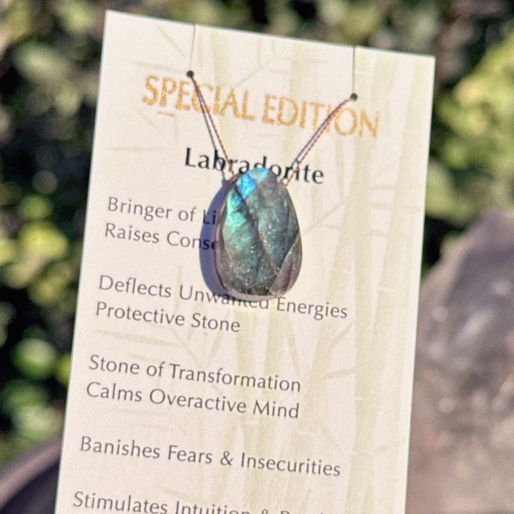 Each necklace is handmade by Austin artist Sheree Jordan. She selects only the highest quality crystals to craft her elegant natural fiber string necklaces. Her signature knot keeps the crystal perfectly centered while the fiber string blends harmoniously on the skin. This keeps the crystal itself the focus.