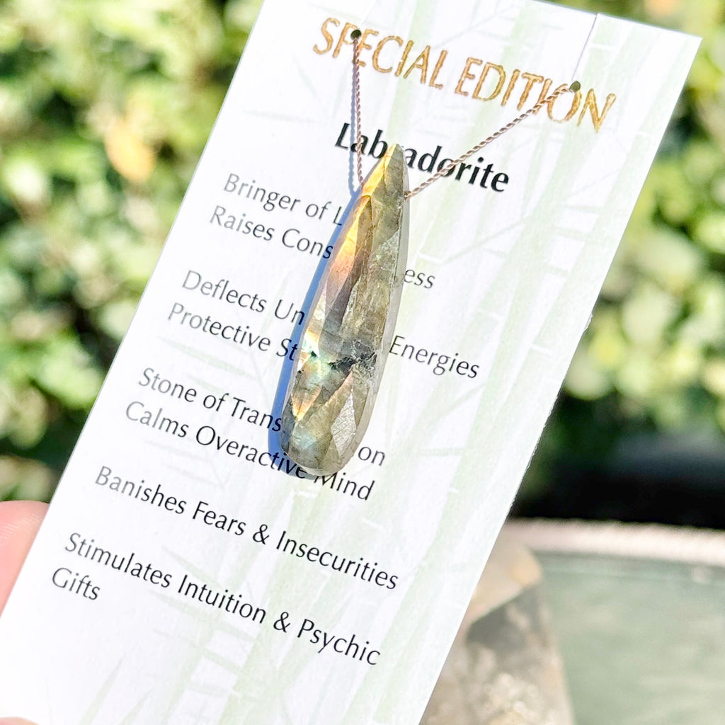Each necklace is handmade by Austin artist Sheree Jordan. She selects only the highest quality crystals to craft her elegant natural fiber string necklaces. Her signature knot keeps the crystal perfectly centered while the fiber string blends harmoniously on the skin. This keeps the crystal itself the focus.